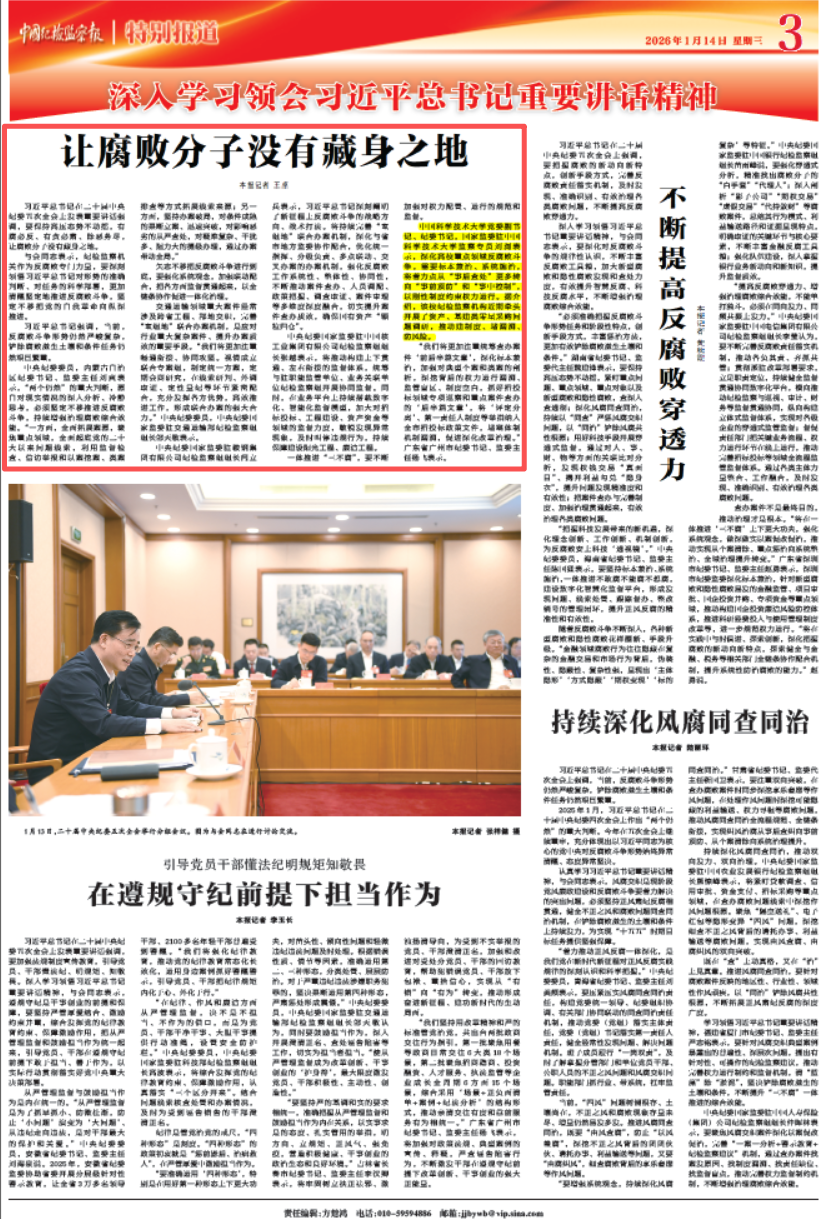 1月14日,中国纪检监察报刊发题为《让腐败分子没有藏身之地》新闻报道。