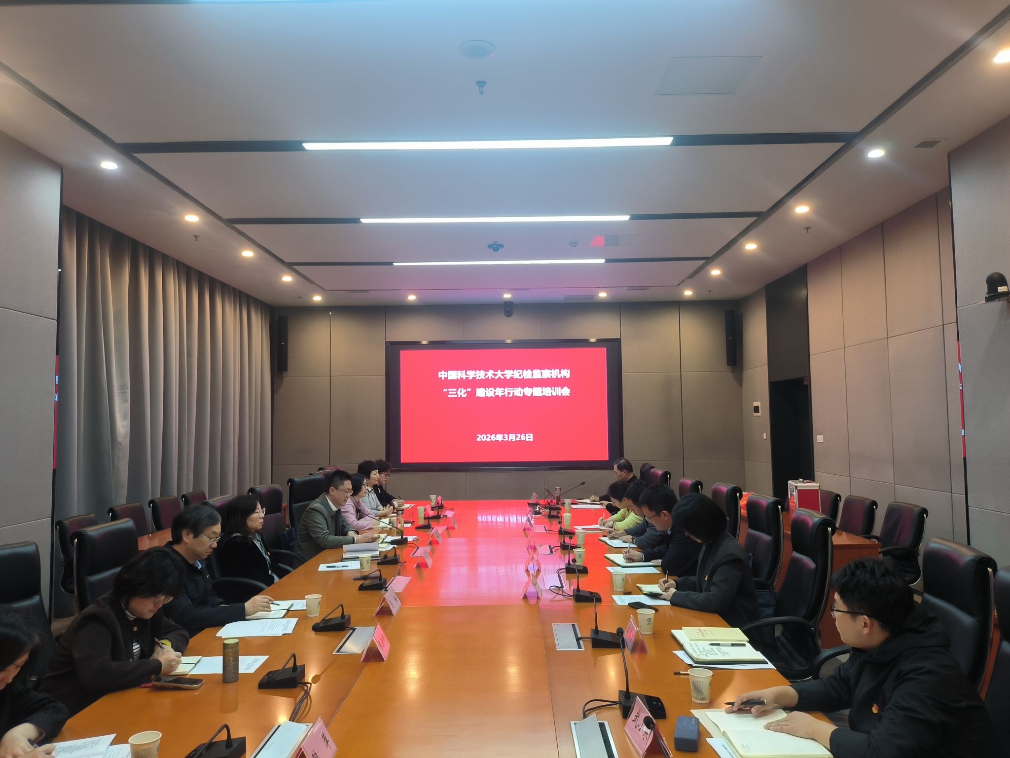 2026年3月26日下午,纪检监察机构举办“纪检监察工作规范化法治化正规化建设年”行动专题培训会,校党委副书记、纪委书记、国家监委驻中国科大监察专员刘浏主持会议并讲话。校纪检监察机构和附属医院纪委专职纪检干部参加会议。