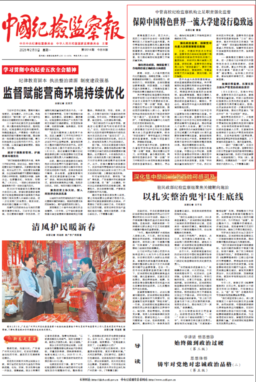 2月9日,中国纪检监察报刊发题为《中管高校纪检监察机构立足职责强化监督 保障中国特色世界一流大学建设行稳致远》新闻报道。